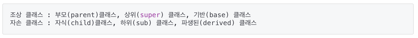 - Childe 클래스와 Parent 클래스는 서로 상속 관계에 있다고 하며, 상속해주는 클래스를 '조상 클래스'라 하고 상속 받는 클래스를 '자손 클래스'라 한다.