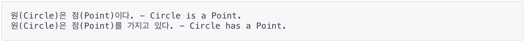 - 두 경우를 비교해보면 Circle클래스를 작성하는데 있어서 Point클래스를 포함시키거나 상속받도록 하는것은 결과적으로 별 차이가 없다.