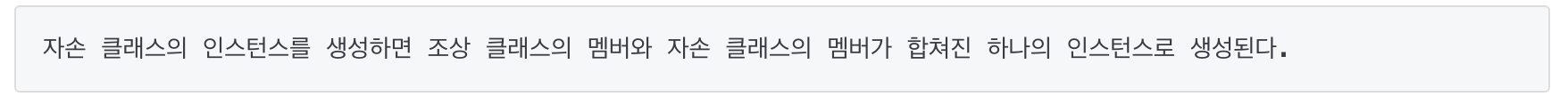- 자손 클래스는 조상 클래스의 모든 멤버를 상속받기 때문에, Child 클래스는 Parent 클래스의 멤버들을 포함한다고 할 수 있다.