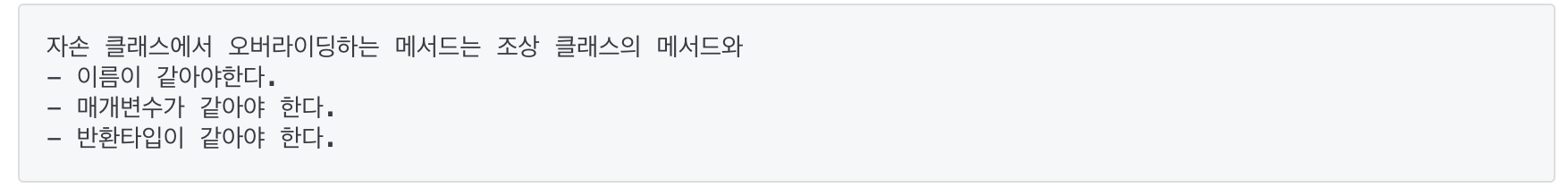 - 선언부가 서로 일치해야 한다. 다만 접근 제어자(access modifier)와 예외(exception)는 제한된 조건 하에서만 다르게 변경할 수 있다.