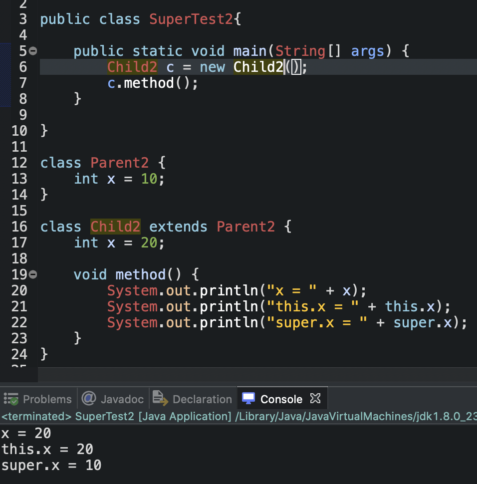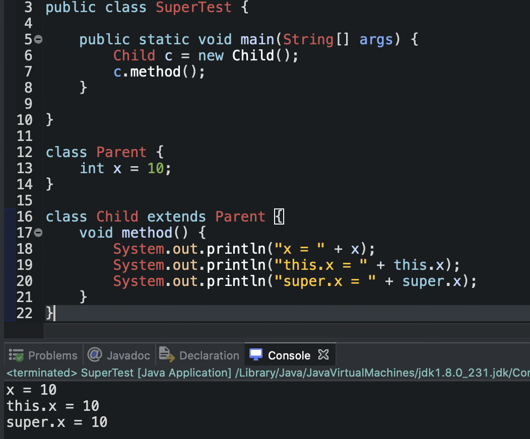- 조상의 멤버와 자신의 멤버를 구별하는데 사용된다는 점을 제외하고는 sujper는 this와 근본적으로 같다.