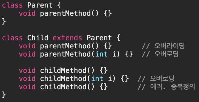 오버로딩은 기존에 없는 새로운 메서드를 추가하는 것이고, 오버라이딩은 조상으로부터 상속받은 메서드의 내용을 변경하는 것이다.