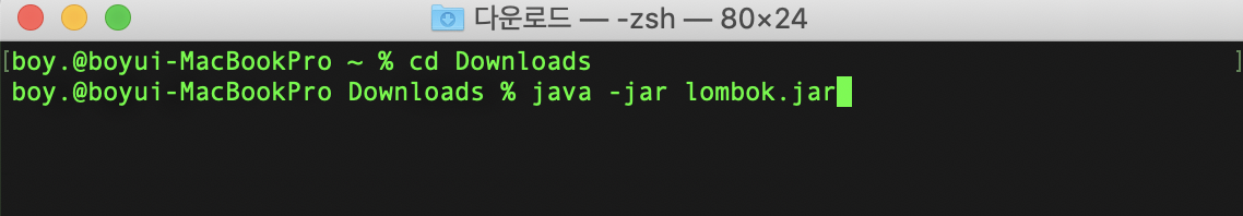 터미널을 실행시키고 저장한 도큐먼트로 이동하여 java -jar lombok.jar 입력한다.