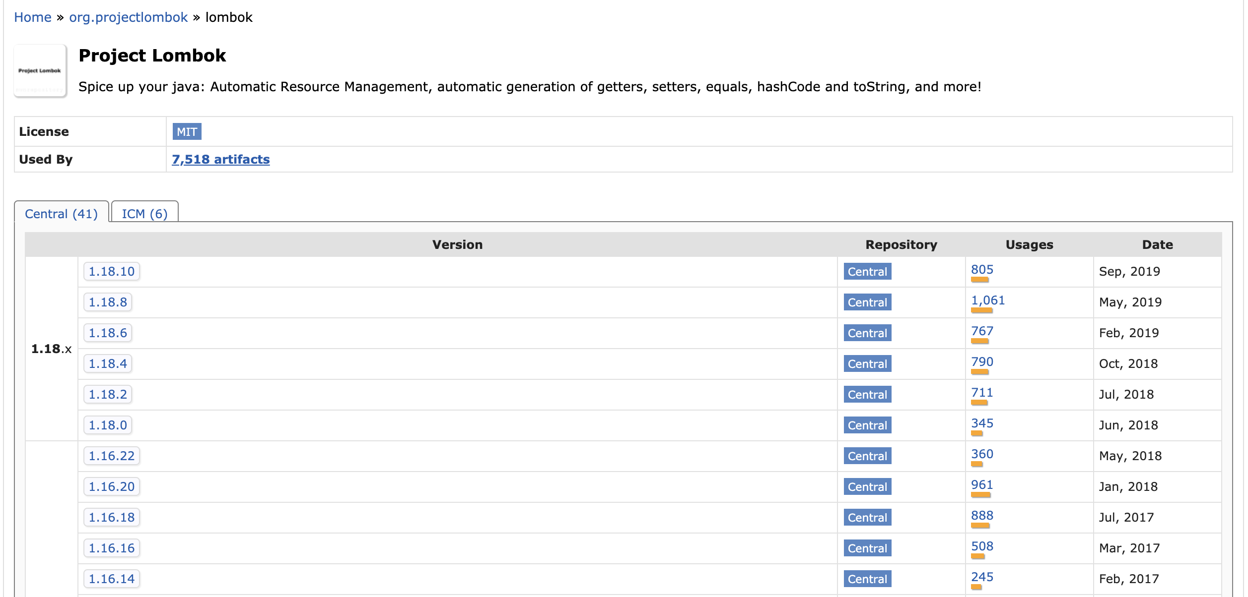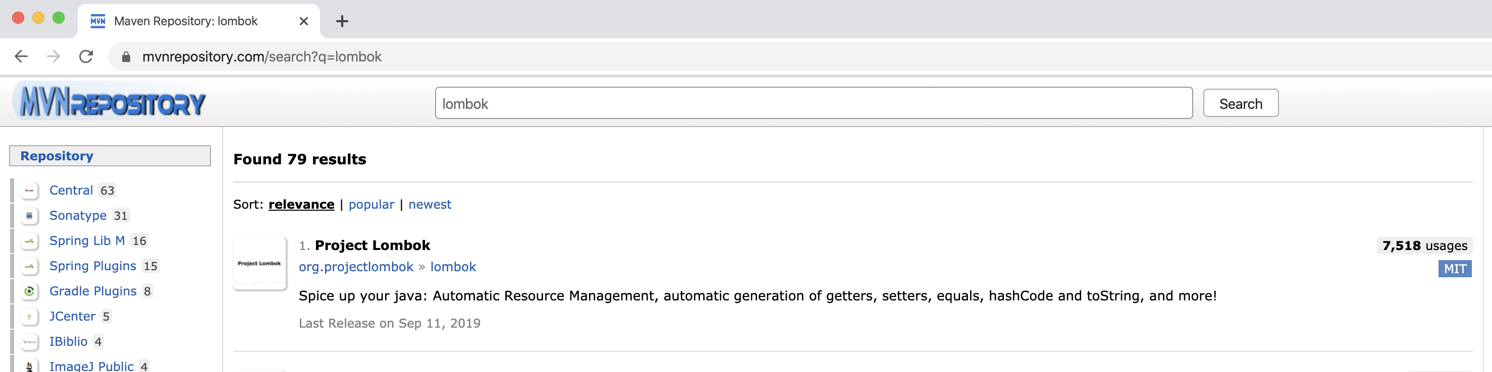 Maven Repository에 접속해서 lombok 검색하고 가장 상위에 있는 Project Lombok을 클릭한다.