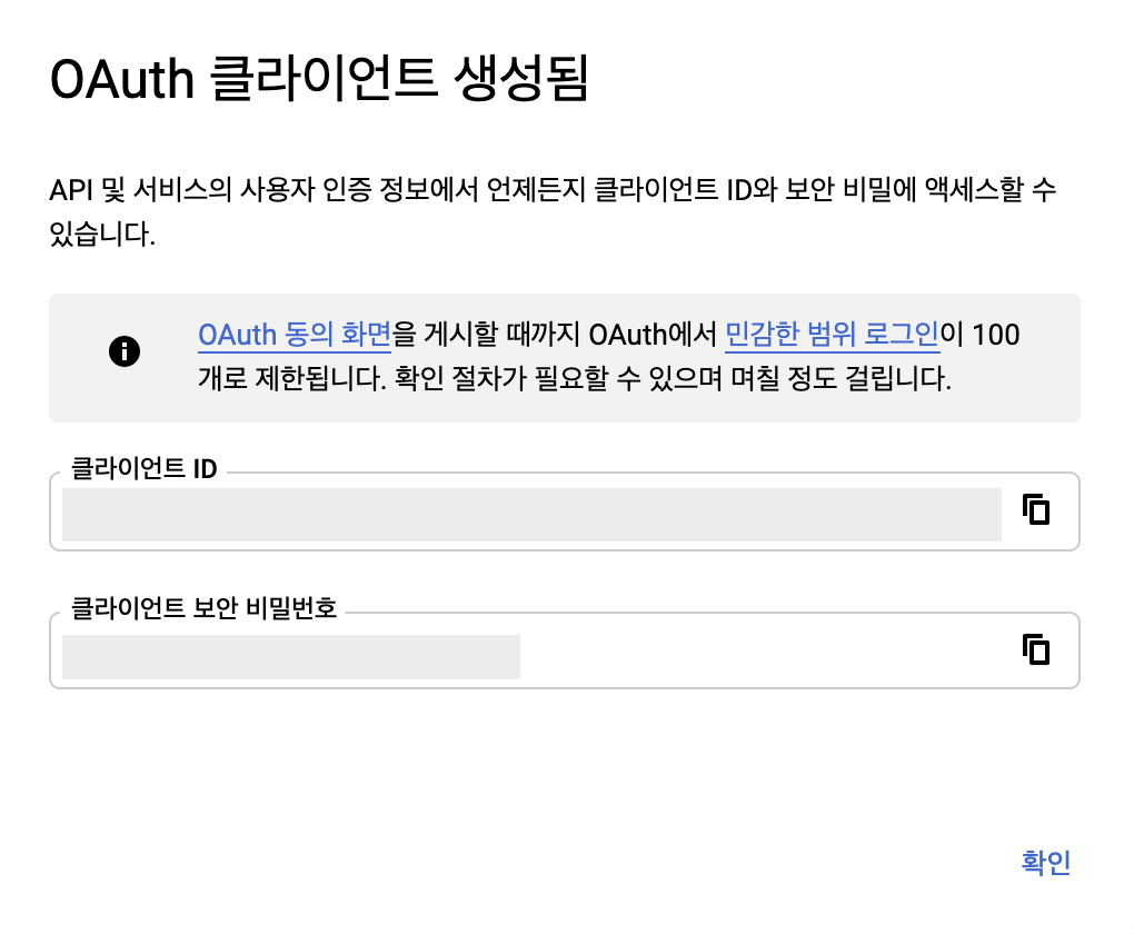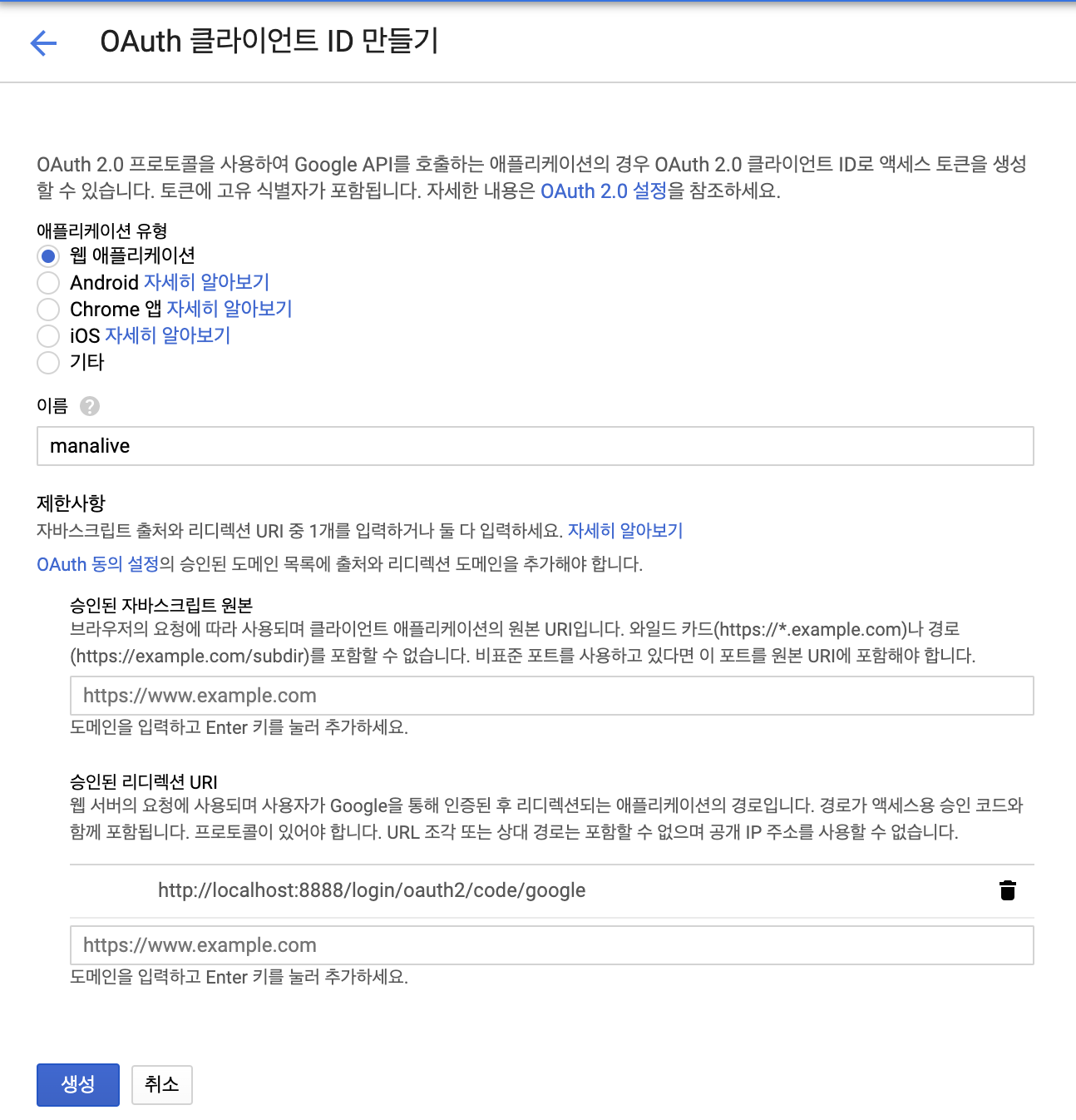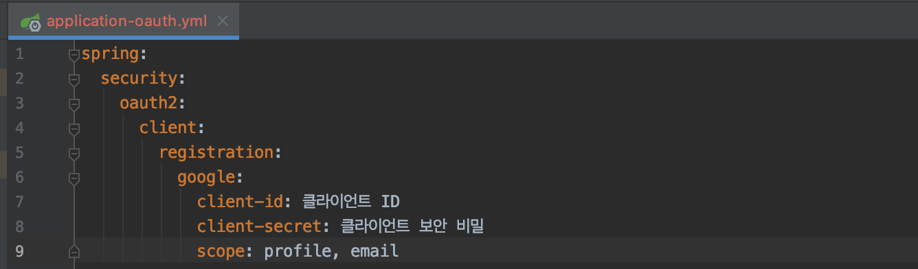 - scope의 기본값은 openid, profile, email이다. profile과 email만 등록한 이유는 openid라는 scope가 존재하면 Open ID Provider로 인식하기 때문이다. 이렇게 되면 OpenID Provider인 서비스(google)와 그렇지 않은 서비스(네이버/카카오 등)로 나눠서 각각 OAuth2Service를 만들어야 하므로 하나의 OAuth2Service로 사용하기 위해 openid scope를 빼고 등록한다.